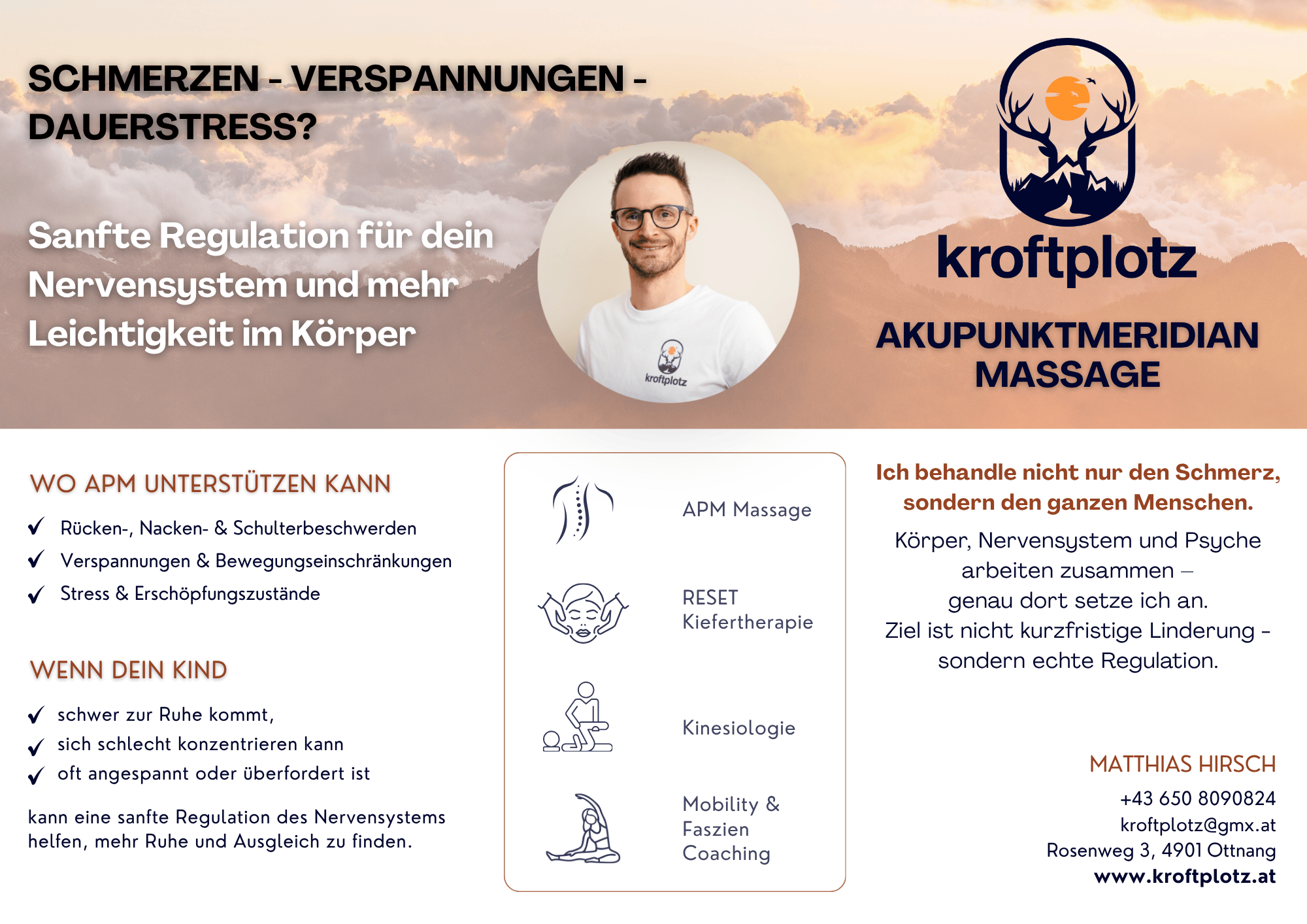 Zum Angebot gehören unter anderem APM-Massagen, RESET-Kiefertherapie, Kinesiologie sowie Mobility- und Faszien-Coaching. Die Praxis richtet sich sowohl an Erwachsene mit Stress- oder Schmerzthemen als auch an Kinder, die unter Unruhe, Konzentrationsproblemen oder Überforderung leiden.
