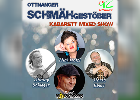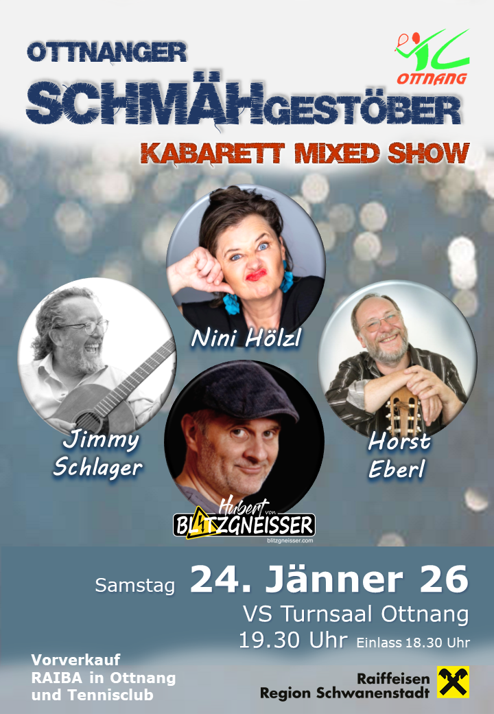 Der Tennisclub Ottnang lädt am Samstag, 24. Jänner 2026 um 19.30 Uhr zum Ottnanger SCHMÄHgestöber ein, einem Kabarettabend (Mixedshow) mit vier Hauptdarsteller:innen: